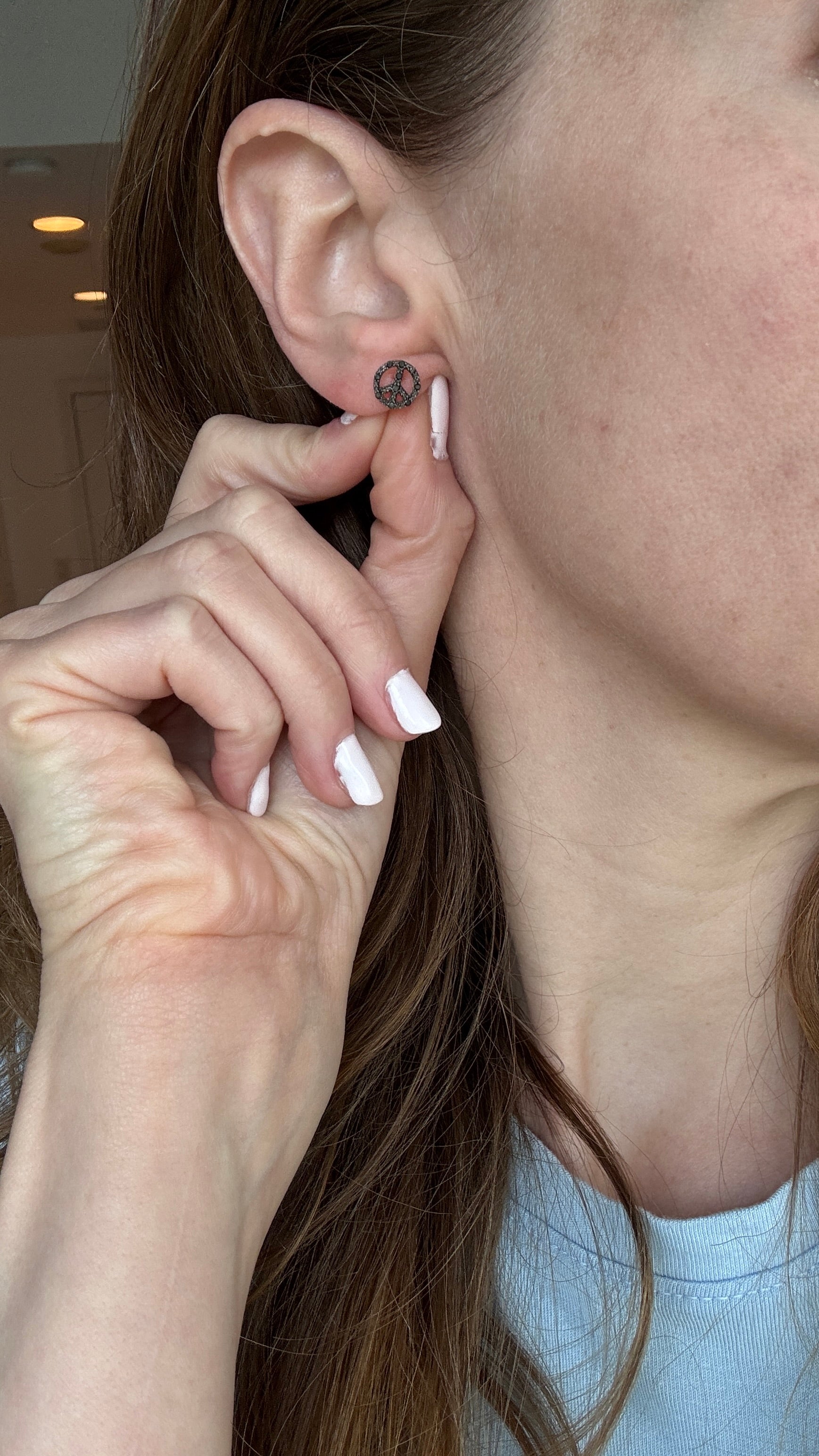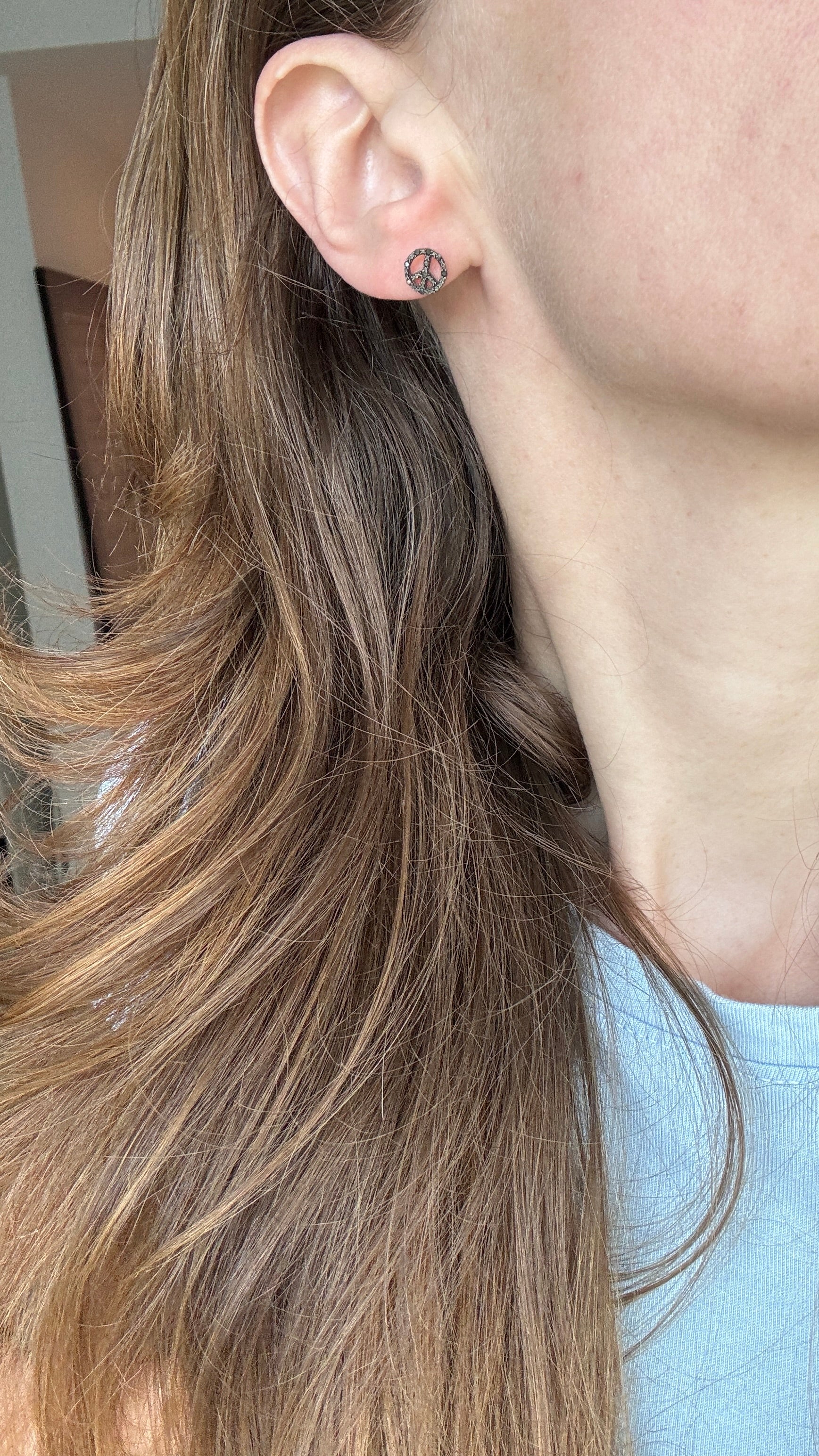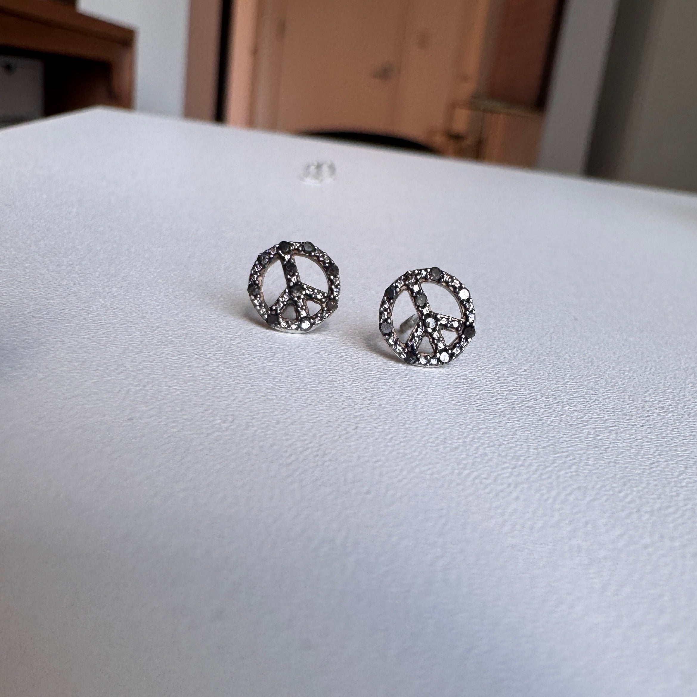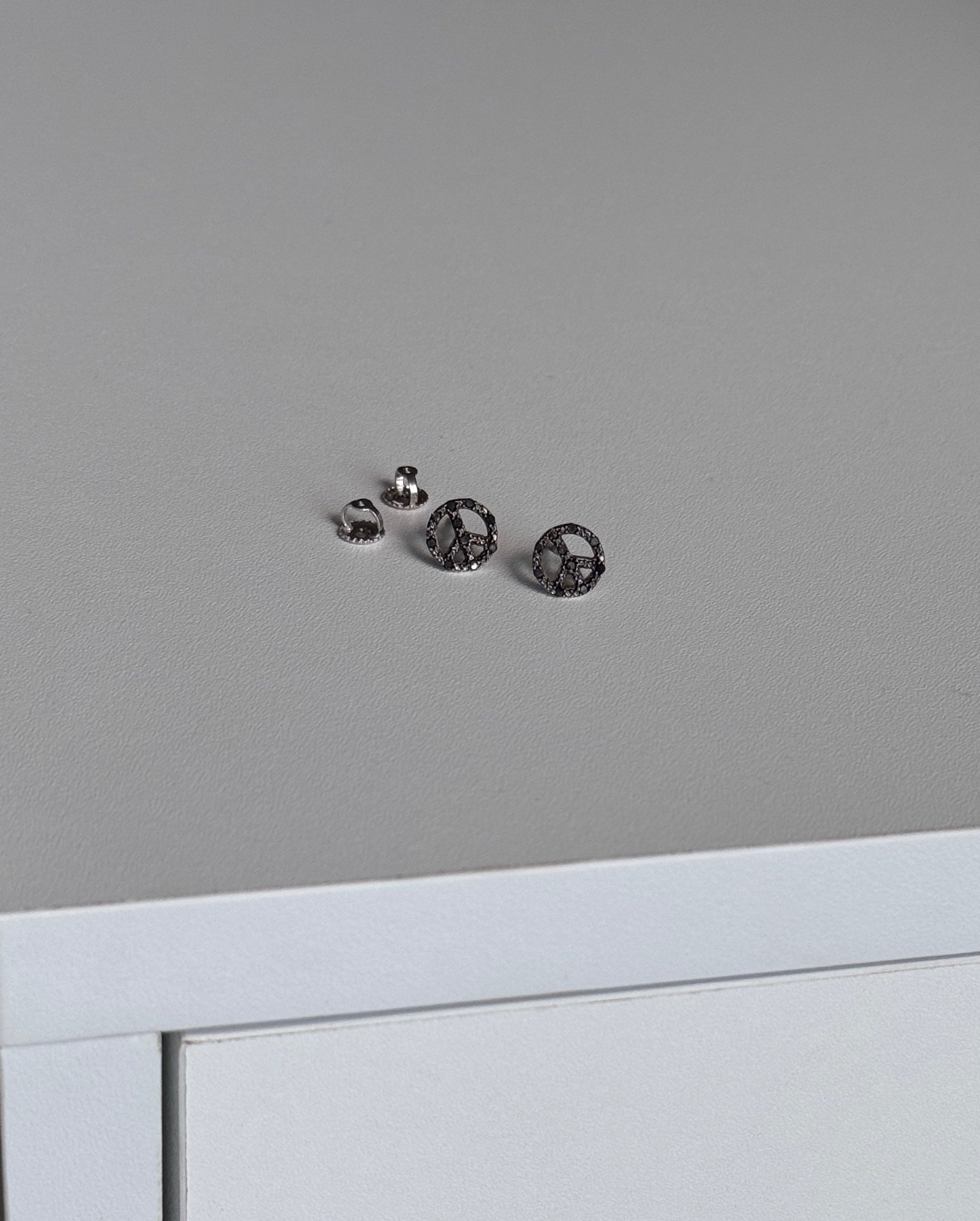 Petite peace sign studs set with natural black diamonds in solid white gold, finished with screw-back posts.